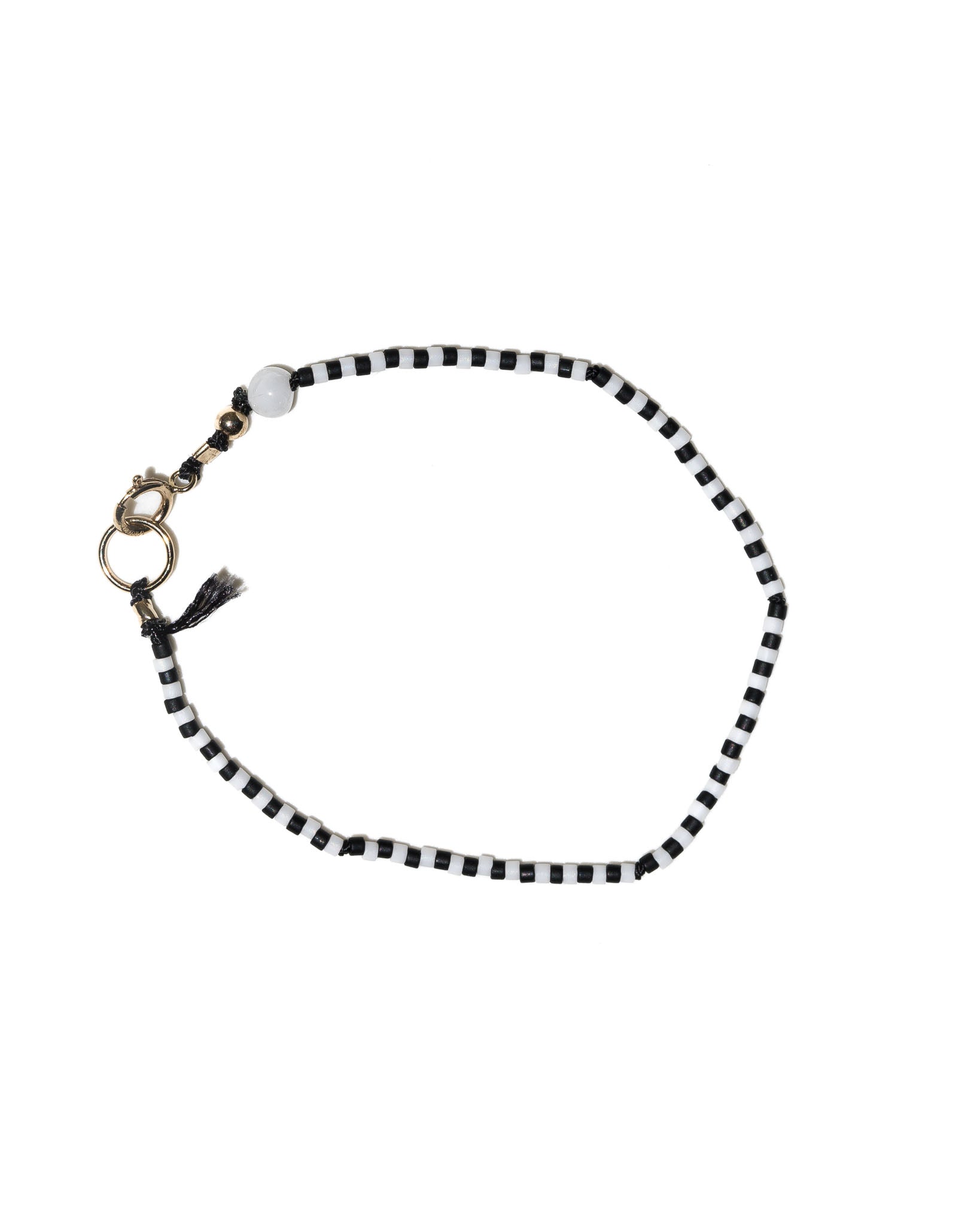 Miyuk black/white glass seed beads with single White Porcelain Jade bead threaded and hand knotted on black cord with 14k gold-filled bead and findings.