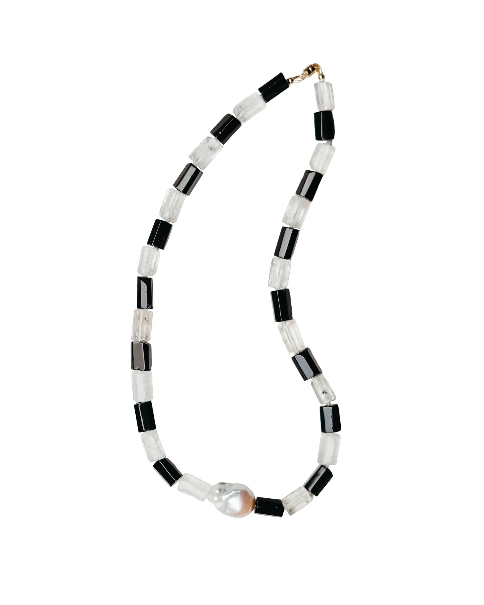 Black Obsidian & Clear Quartz paired with a Freshwater Flameball Pearl, threaded and hand knotted between each stone on white thread.