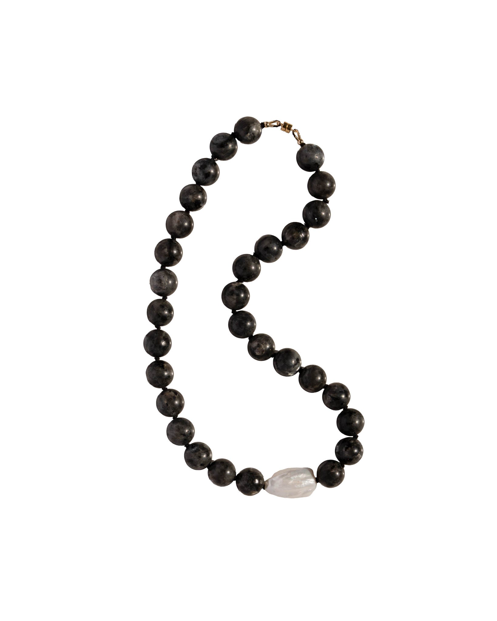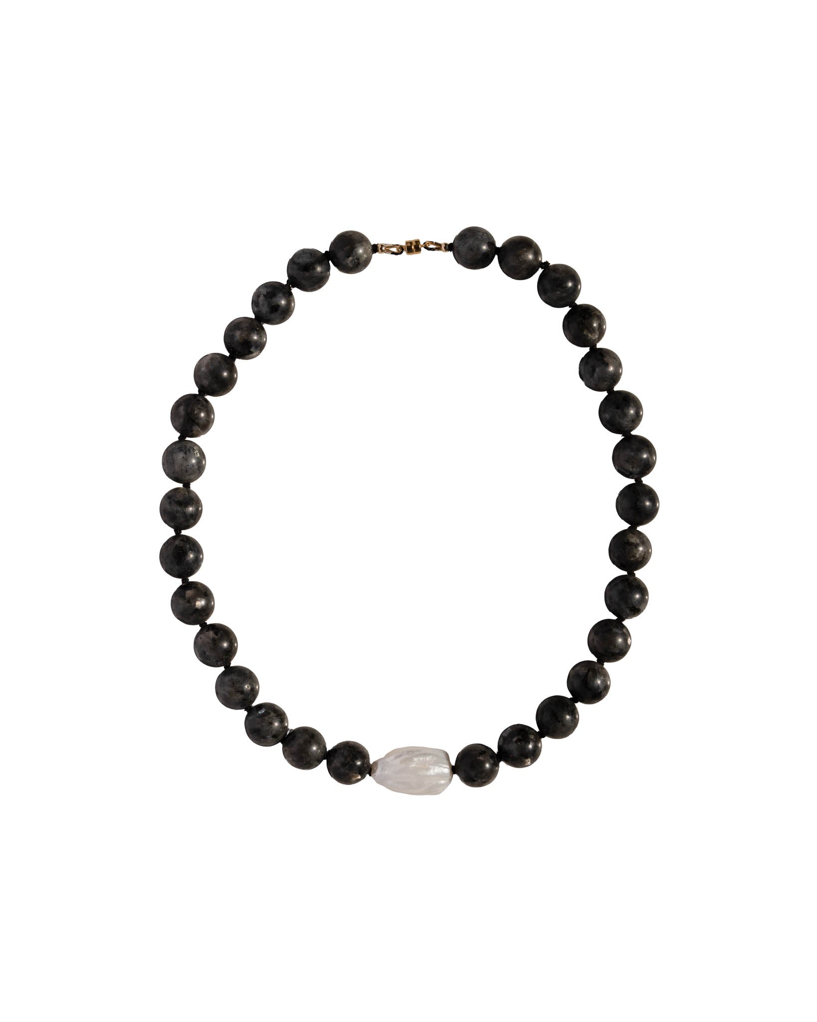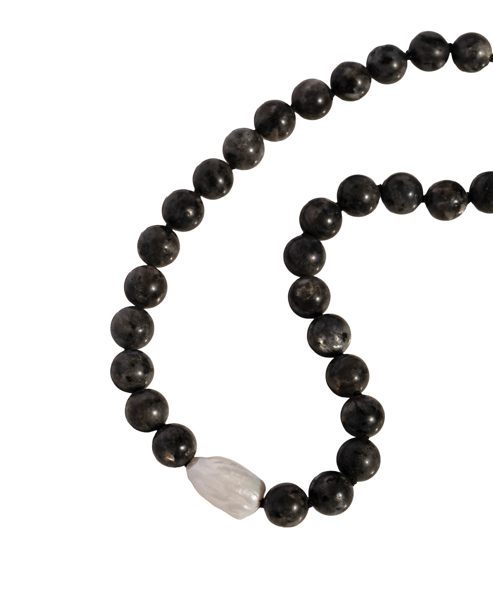 Larvikite Beads paired with a Biwa Freshwater Pearl, threaded and hand-knotted on black silk cord. Finished with 14k gold-filled findings, including the magnetic clasp and beads.