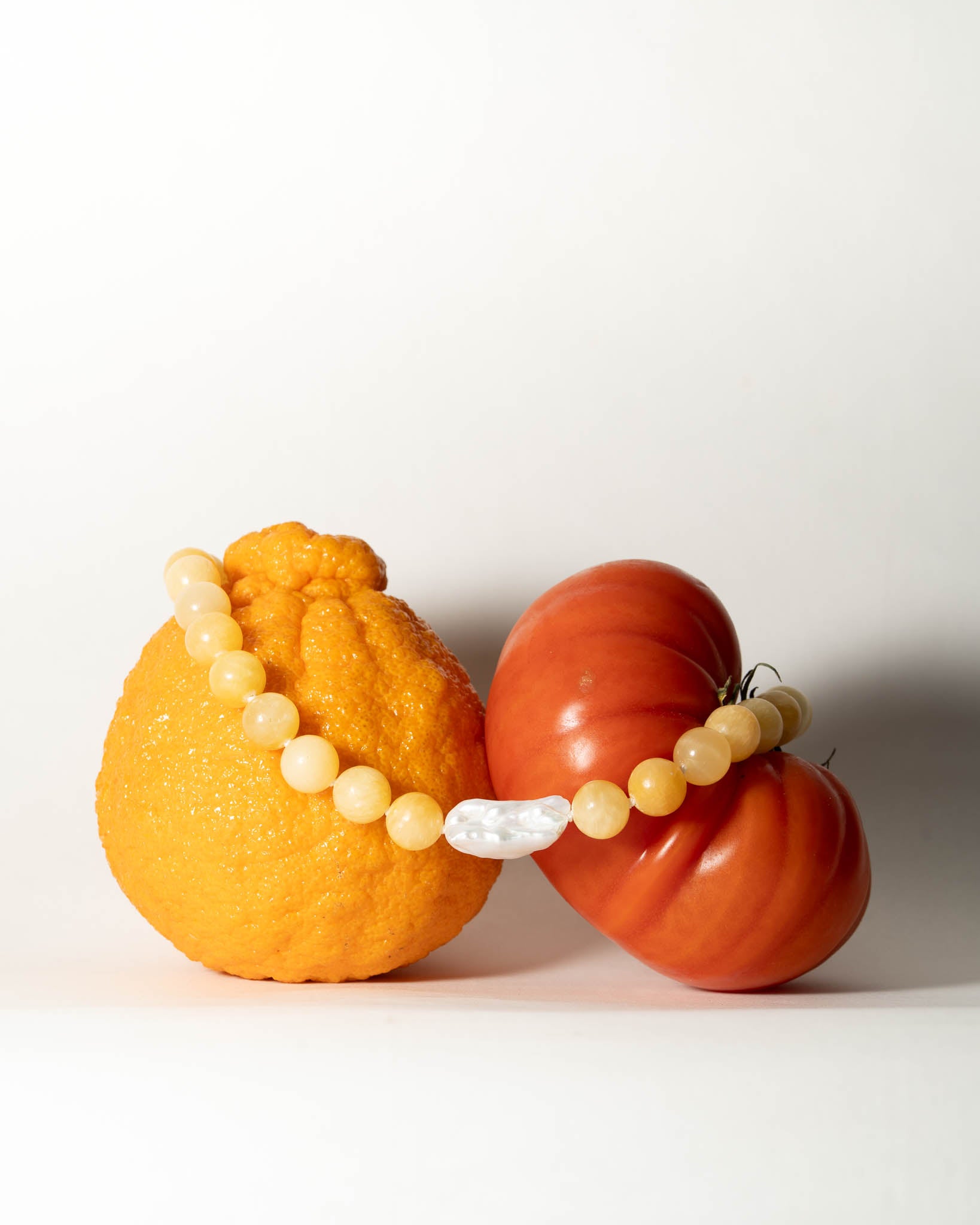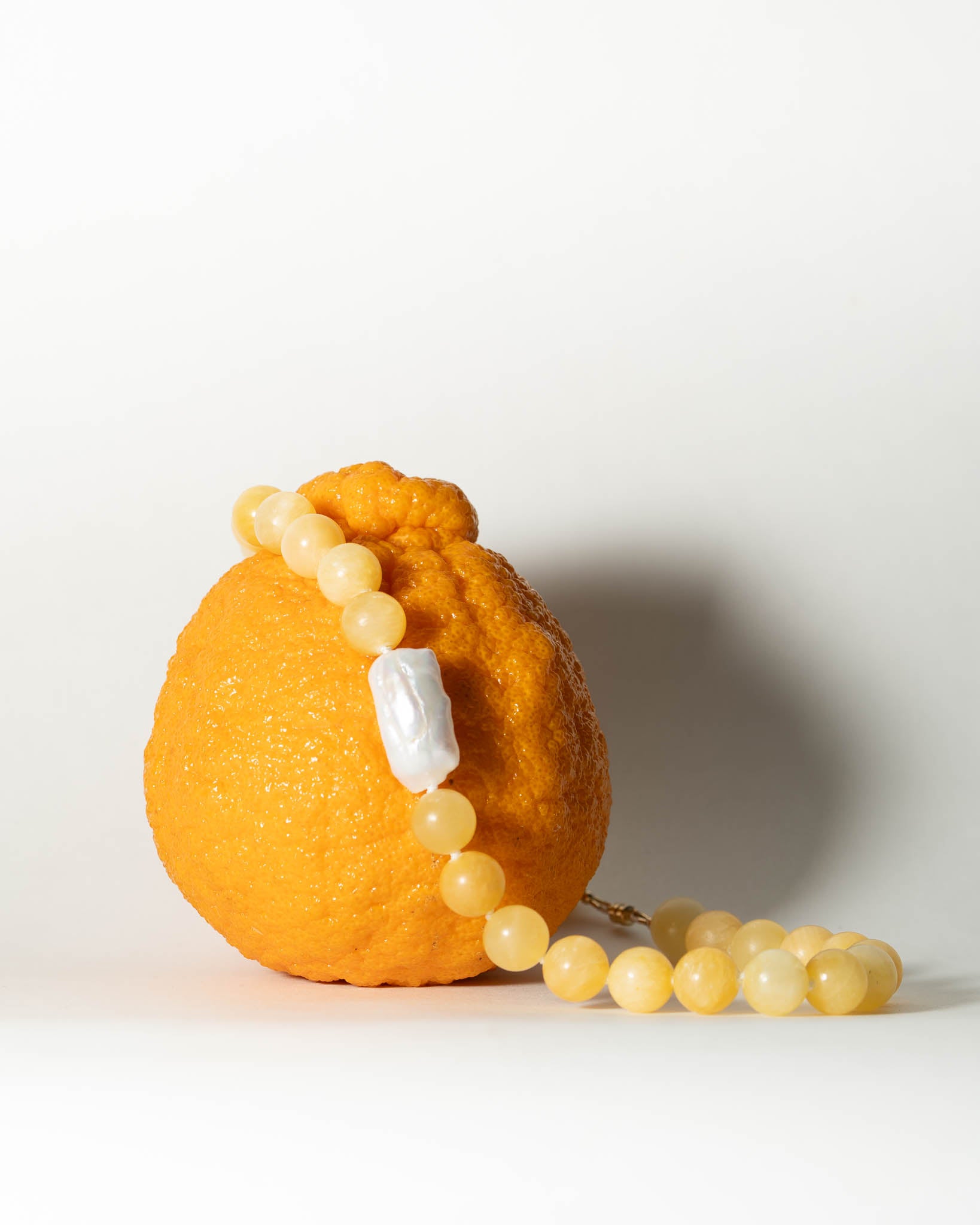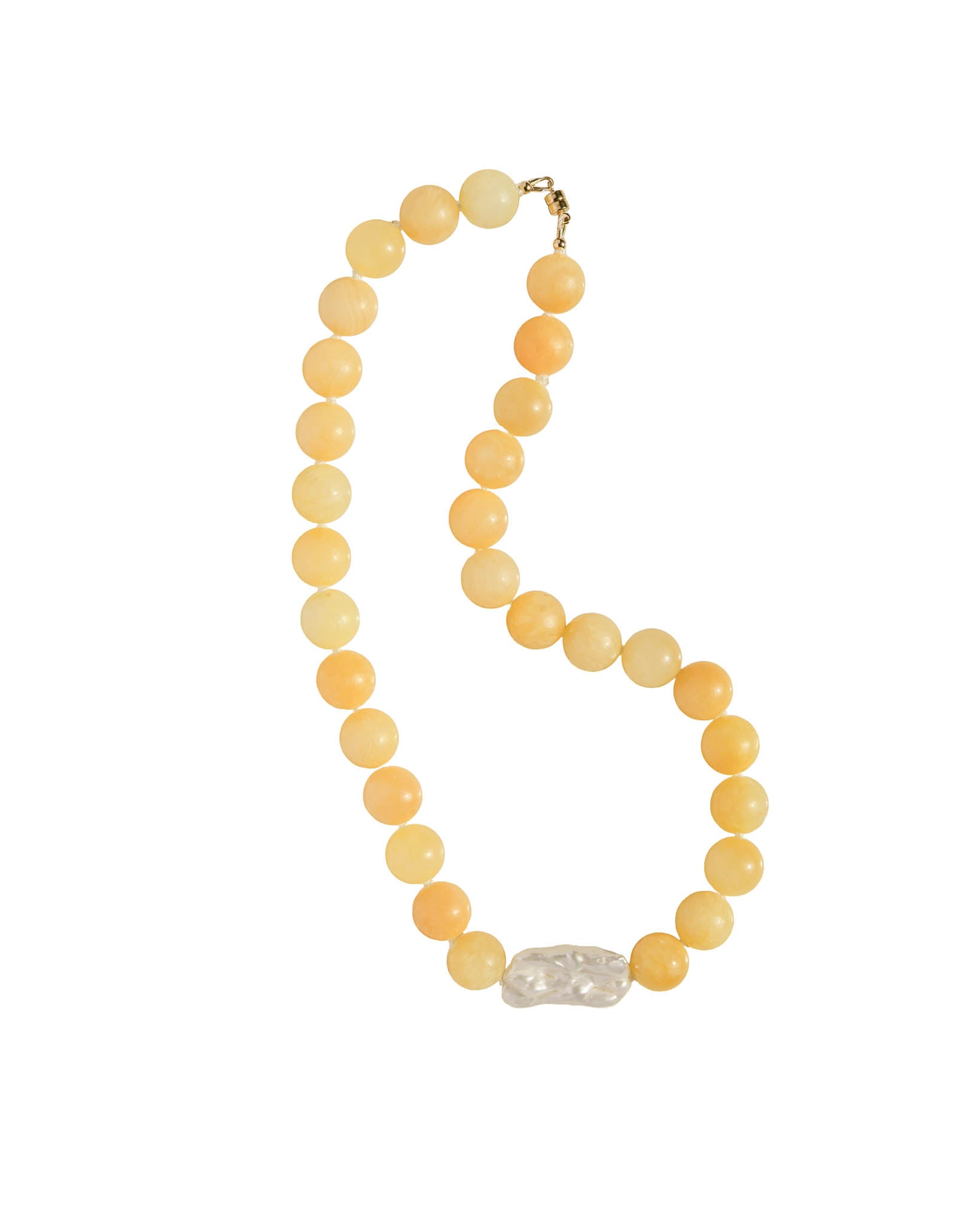 Yellow Jade paired with a Biwa Freshwater Pearl, threaded and hand-knotted on white cord. Finished with 14k gold-filled findings, including the magnetic clasp and beads.