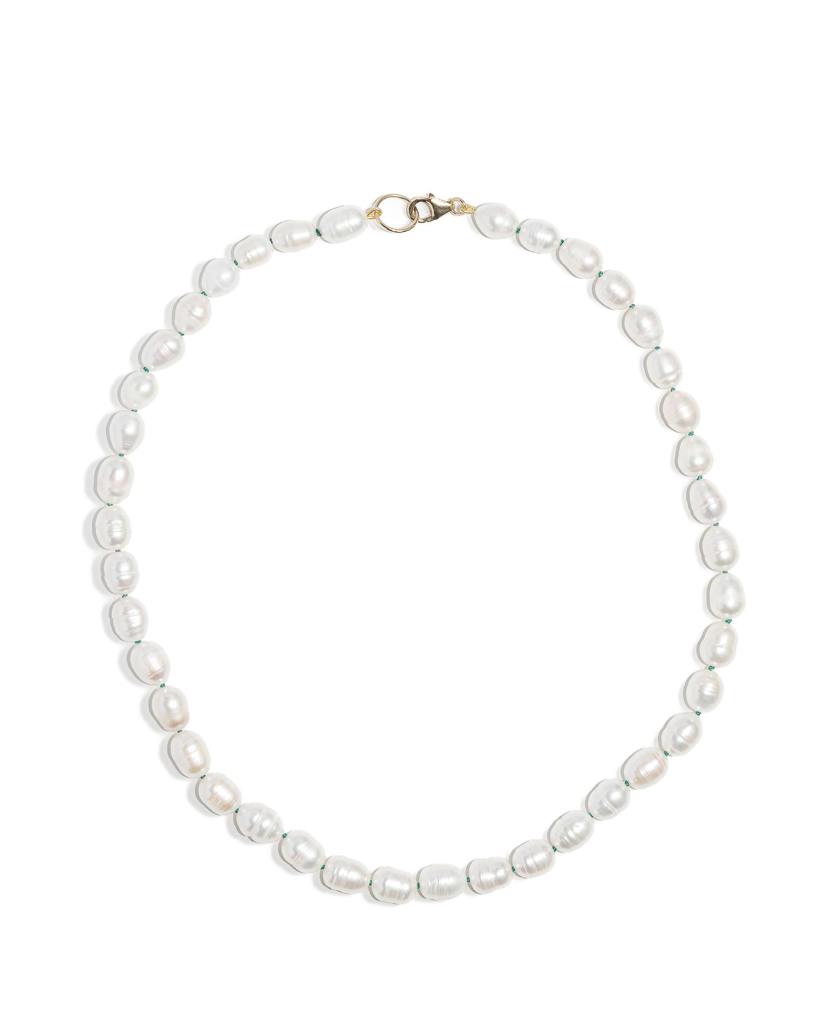 White cultured freshwater rice pearl threaded and hand knotted on green cord. 14k gold-filled findings.