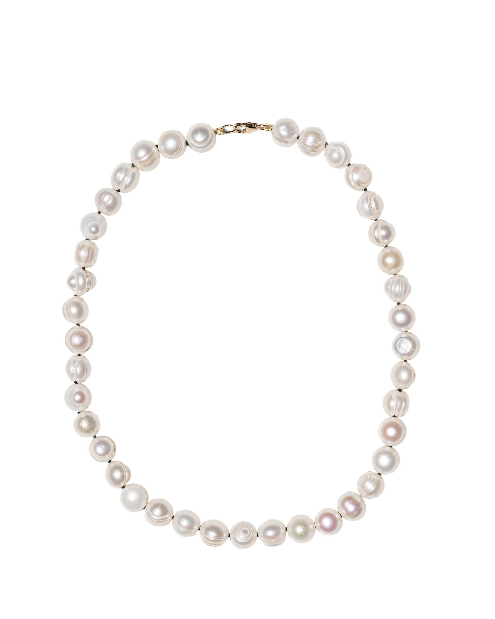 White cultured freshwater round ridged pearl threaded and hand knotted on black cord. 14k gold-filled findings.