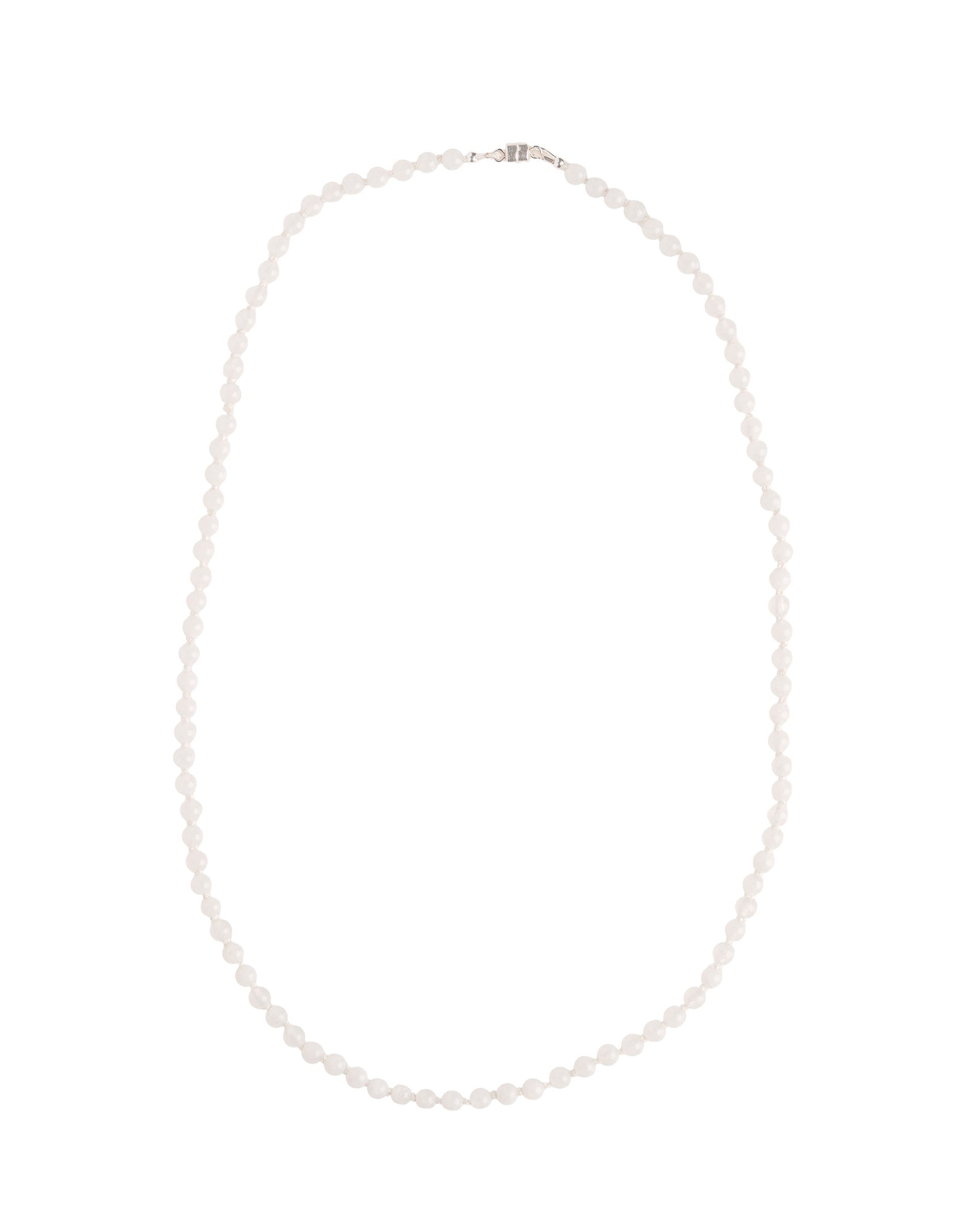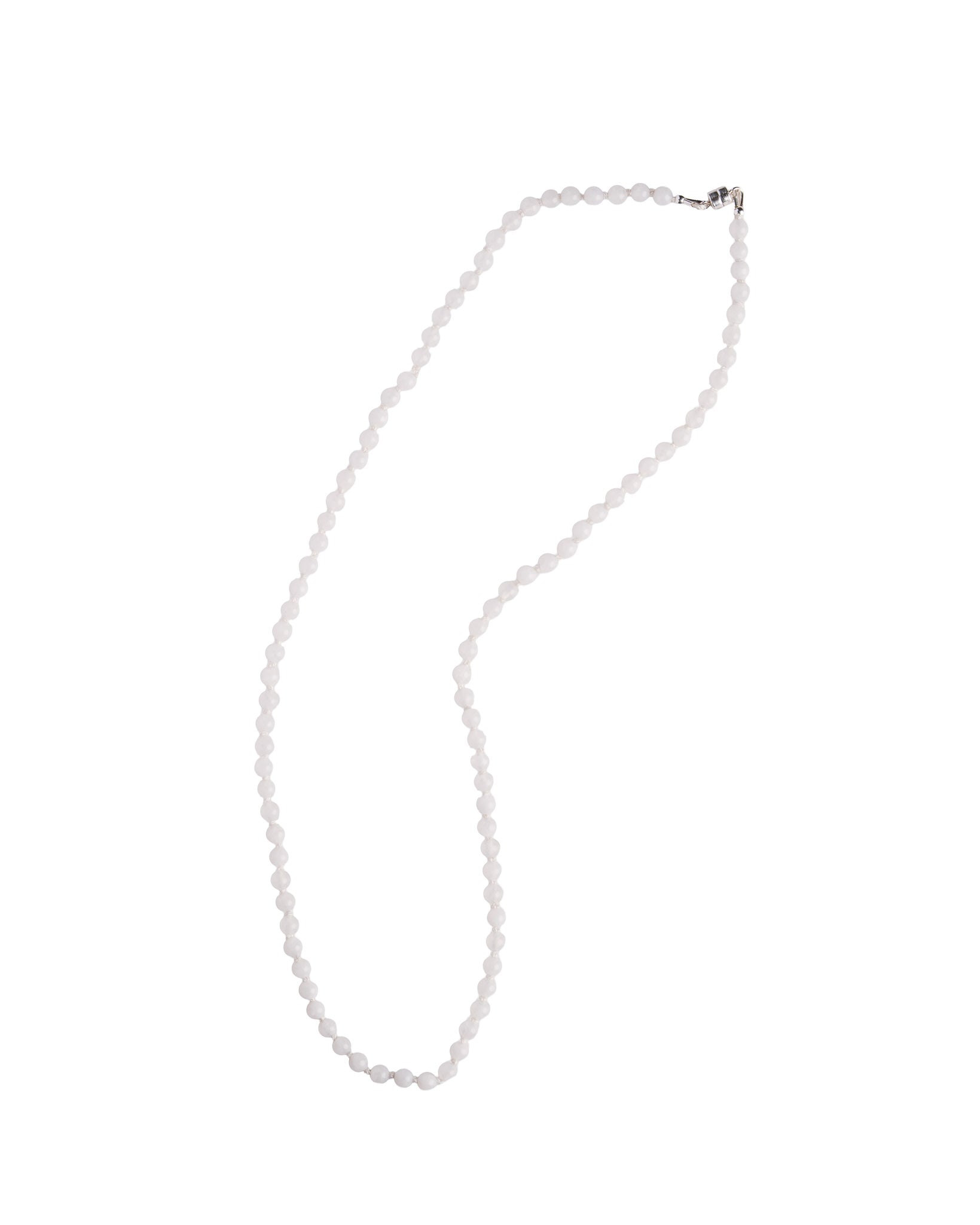 Milky White Jade stones threaded and hand knotted between each stone on white thread with sterling silver findings, magnetic clasp, and beads.