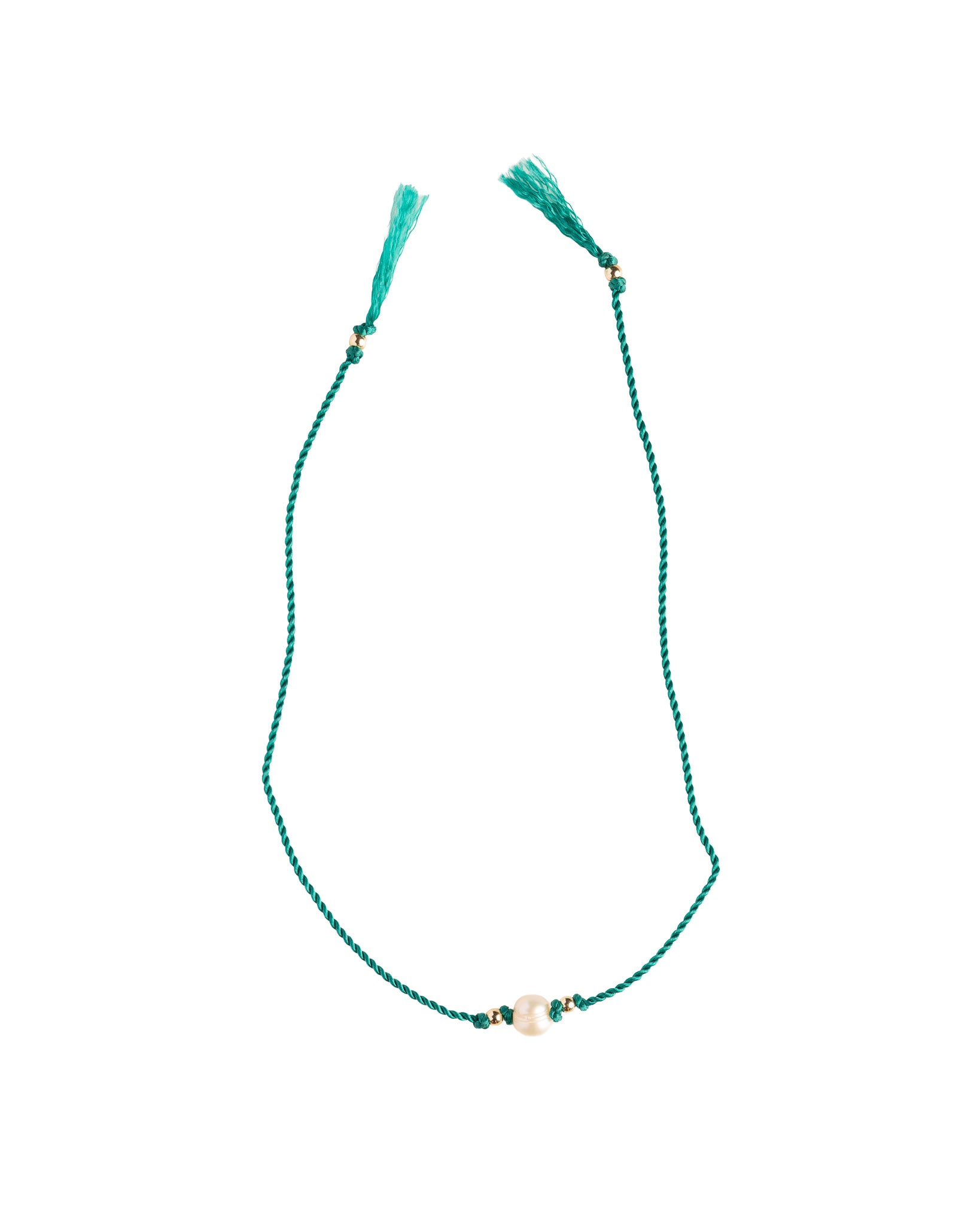 A single Freshwater Pearl, threaded and hand knotted on green cord paired with a 14k gold-filled beads.