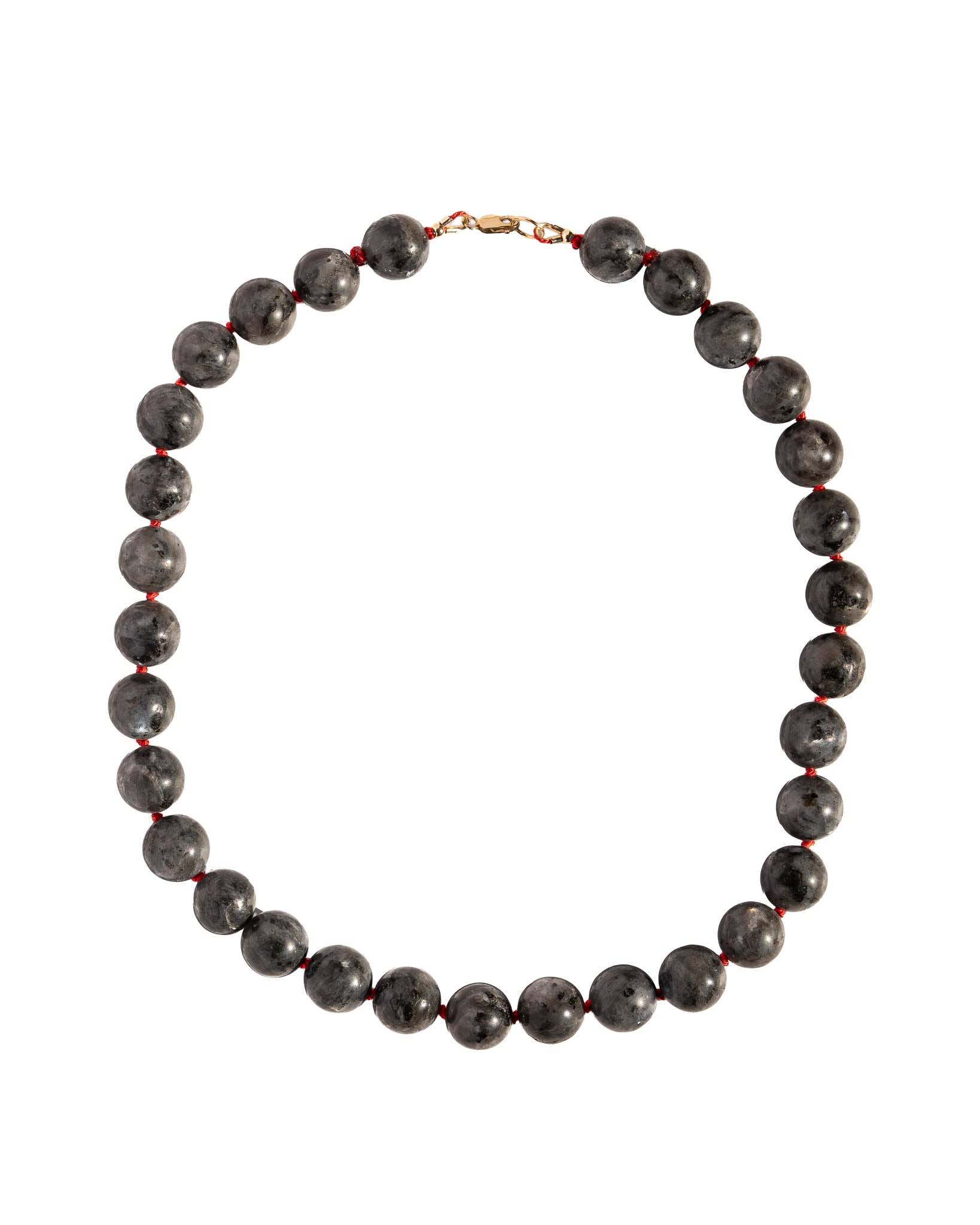Labradorite threaded and hand knotted on red silk cord with 14k gold-filled findings and beads.