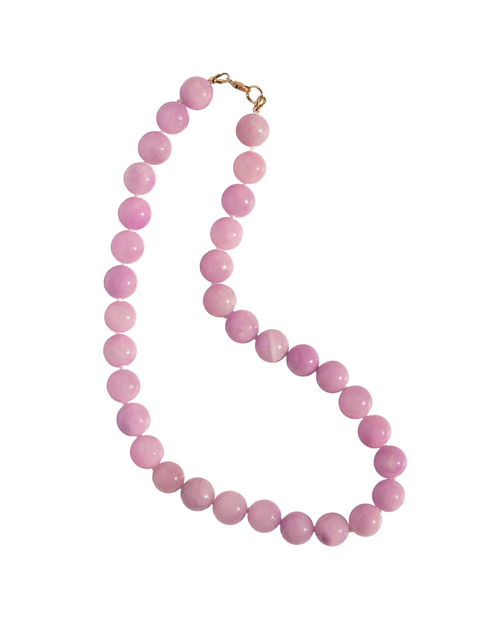 Pink Kunzite Spodumene threaded and hand knotted on white cord with 14k gold-filled findings and beads.