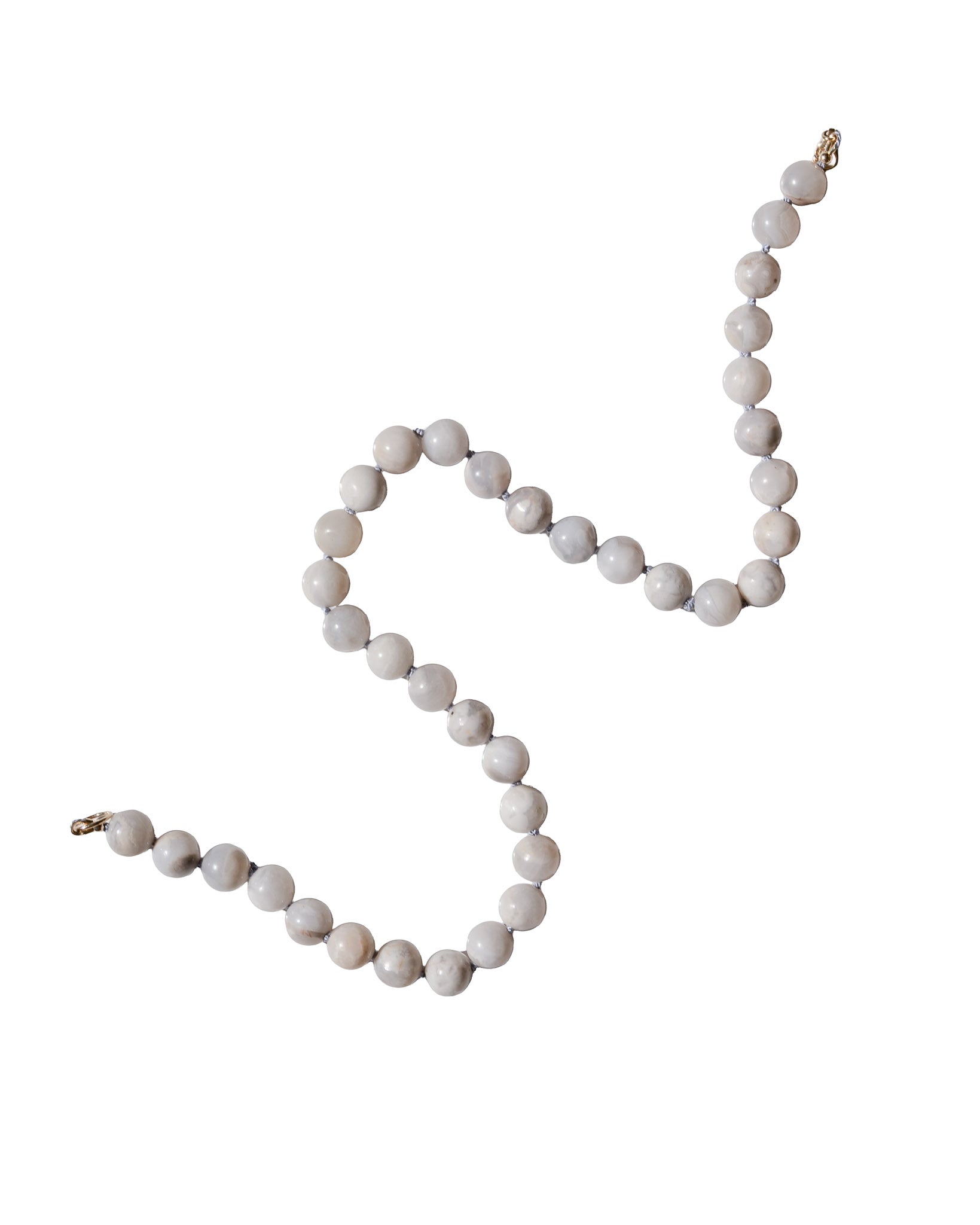 White crazy lace agate polished stones threaded and hand knotted on grey cord with 14k gold-filled findings, clasp and beads.