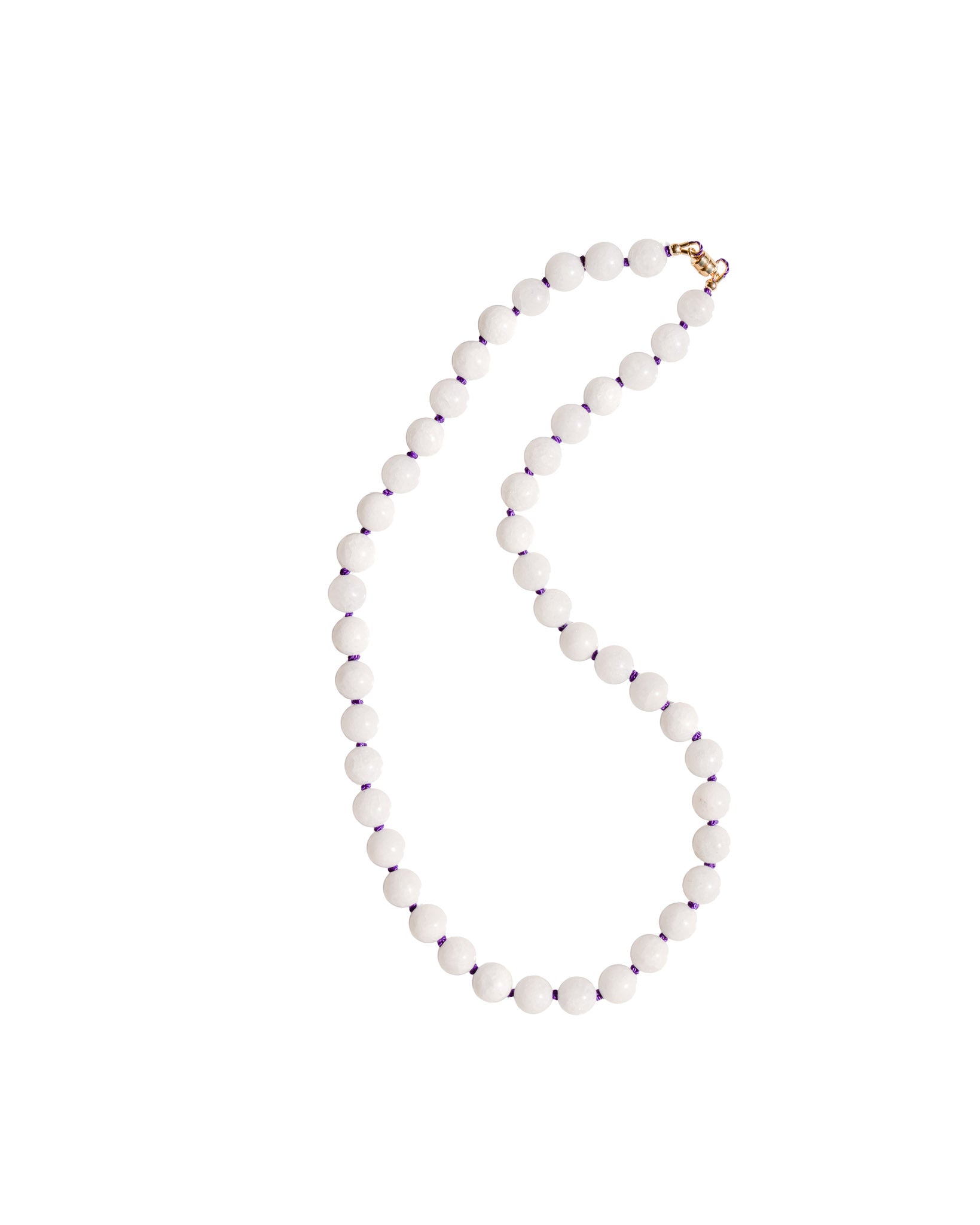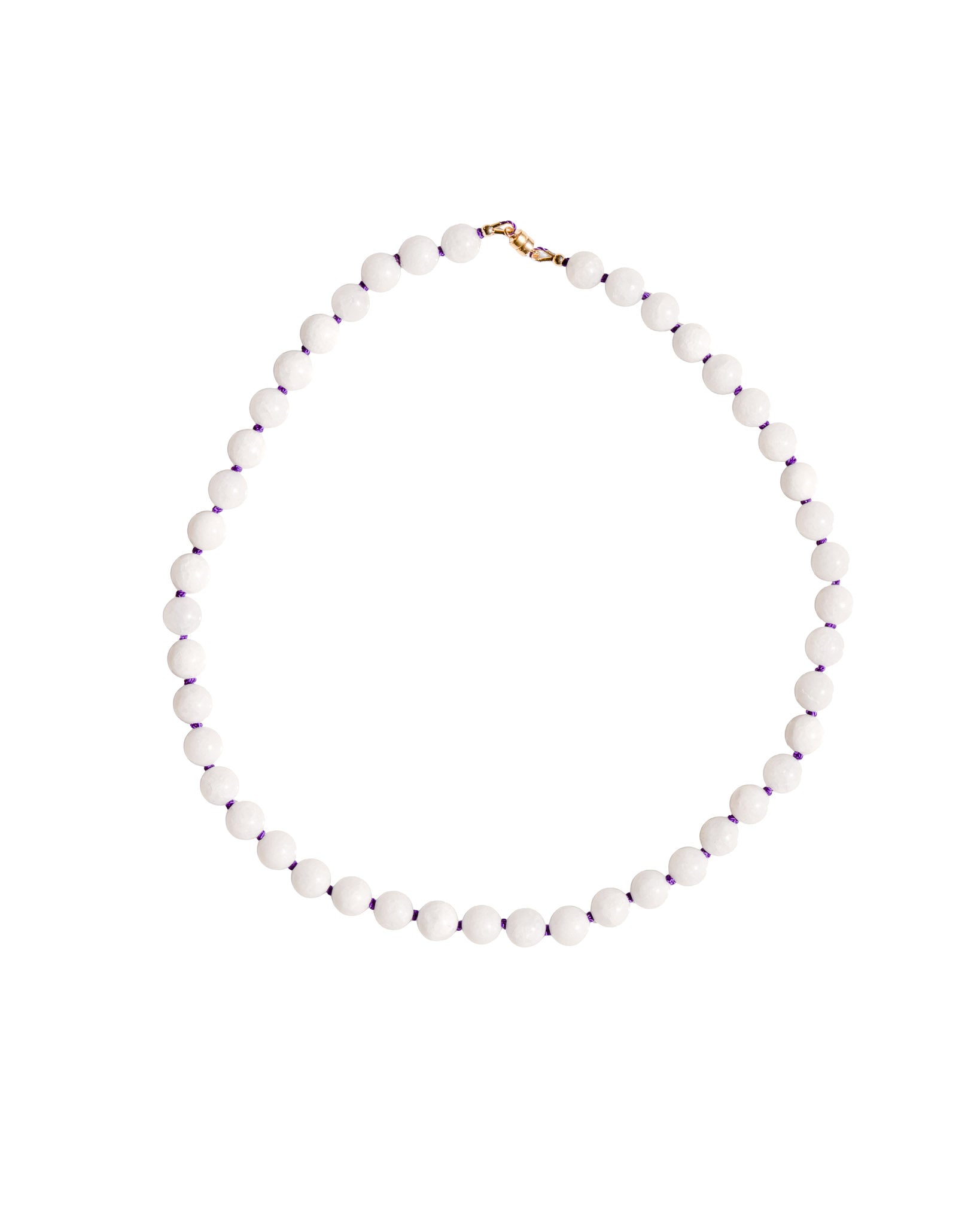 White Jade Porcelan polished stones threaded and hand knotted on purple cord with 14k gold-filled findings, magnetic clasp and beads.