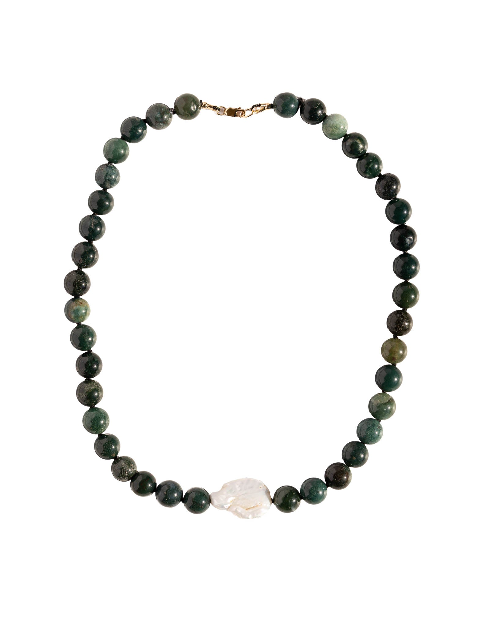 Moss Agate and a Freshwater Pearl threaded and hand knotted on black cord with 14k gold-filled findings and beads.