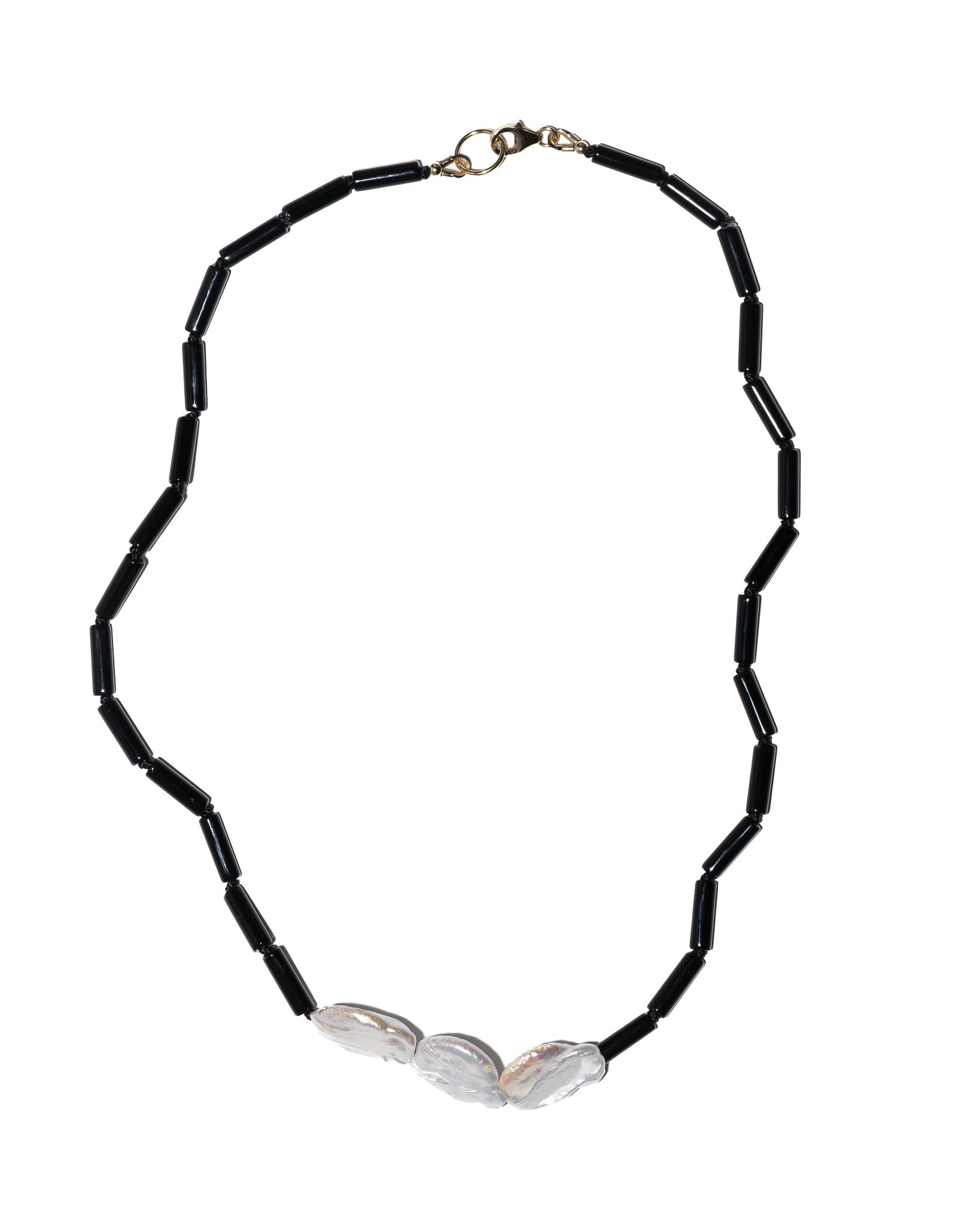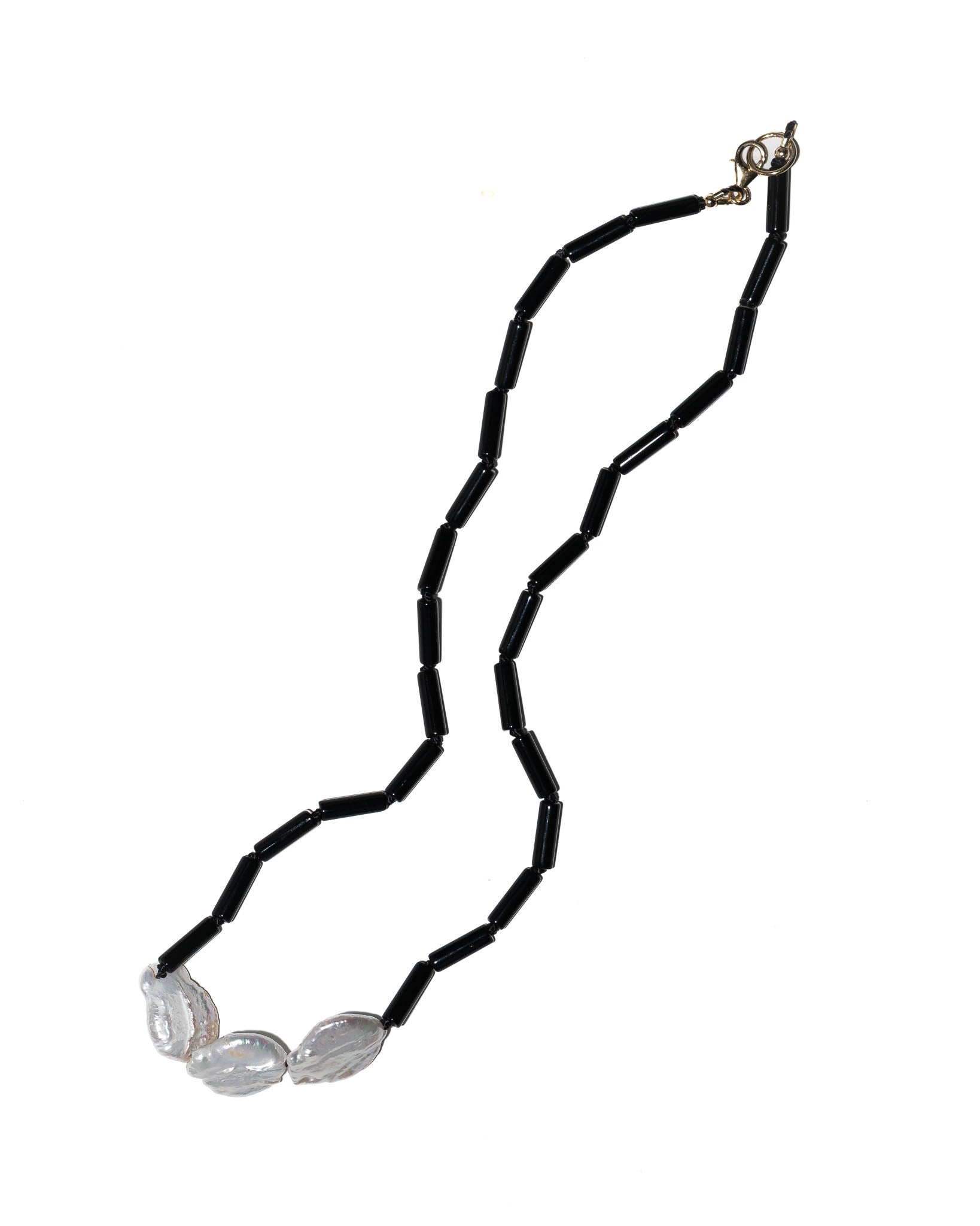 Black Onyx and 3 Freshwater Pearls threaded and hand knotted on cord with 14k gold-filled findings and beads.