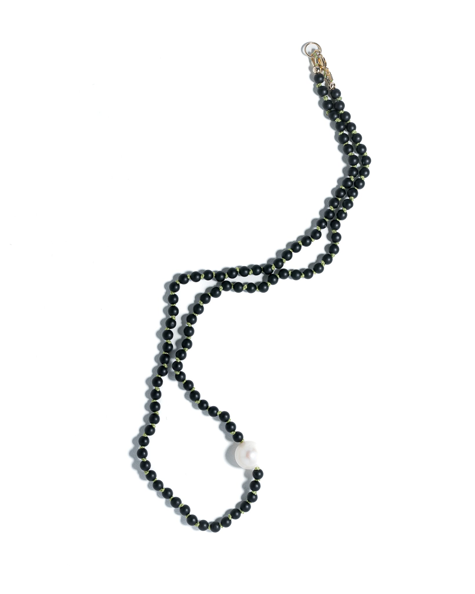 Black agate with single freshwater pearl threaded and hand knotted on light green cord with 14k gold-filled findings.