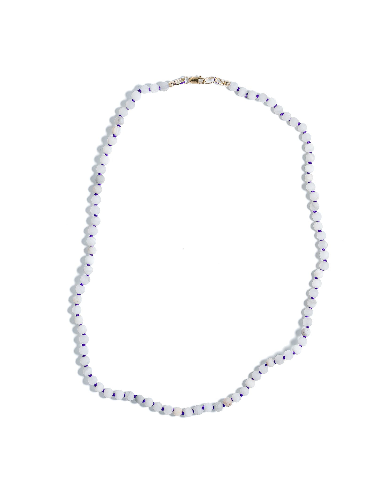 White crazy lace agate threaded and hand knotted on purple cord with 14k gold-filled findings.