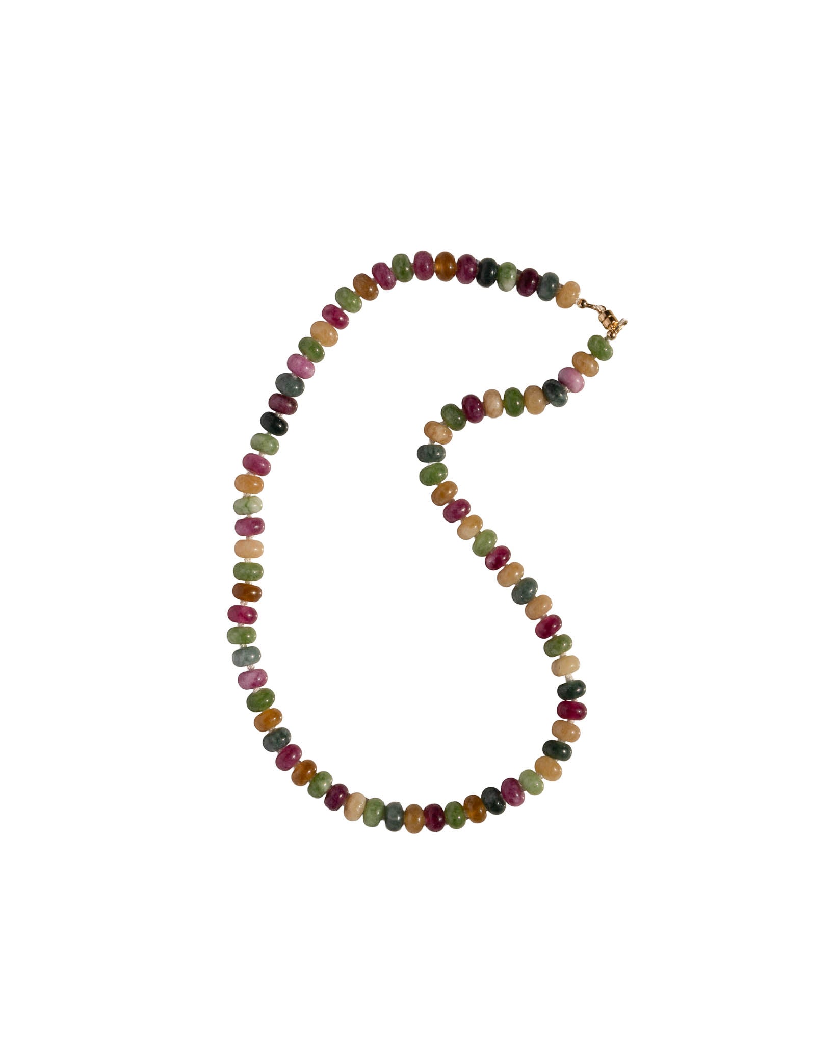Rainbow Jasper Rondelle Beads threaded and hand knotted on white cord with 14k gold-filled findings, magnetic clasp and beads.